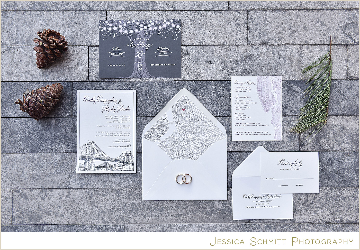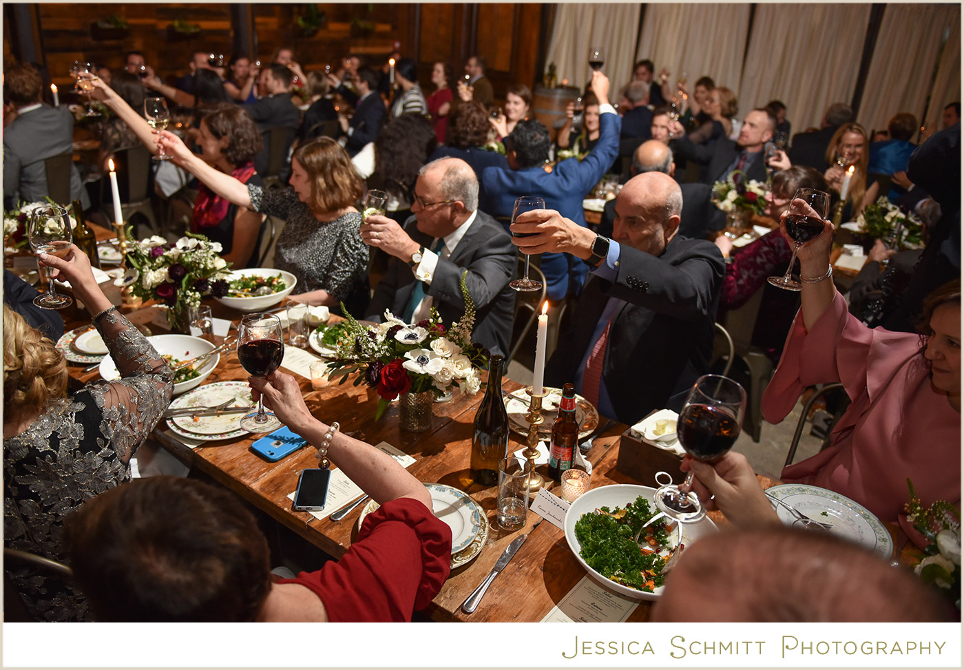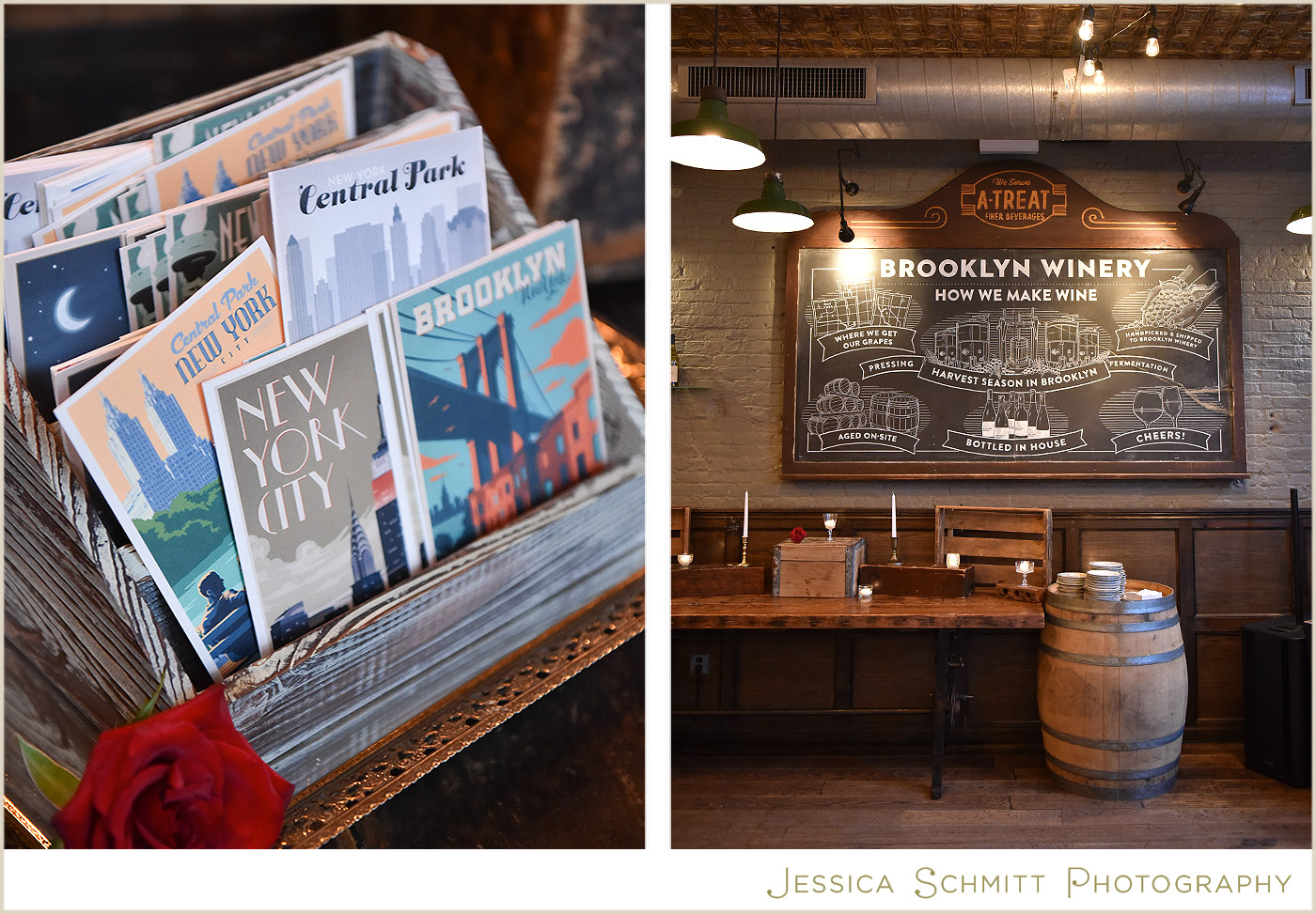 In keeping with the idea of a winter wedding, we incorporated earthy and dark colors and tried to keep our decor simple and understated. We absolutely loved the winery’s mismatched dinnerware and candles, which made each table and place setting unique. We also decided to incorporate different elements of New York City into things like the table numbers and escort board to pay homage to a city that has played such an important role in our relationship and our lives.