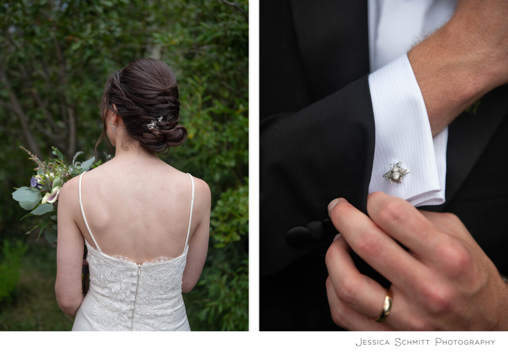We met on the online dating app Bumble, and chose to honor that with matching bee hair pins for me and cuff links for him.