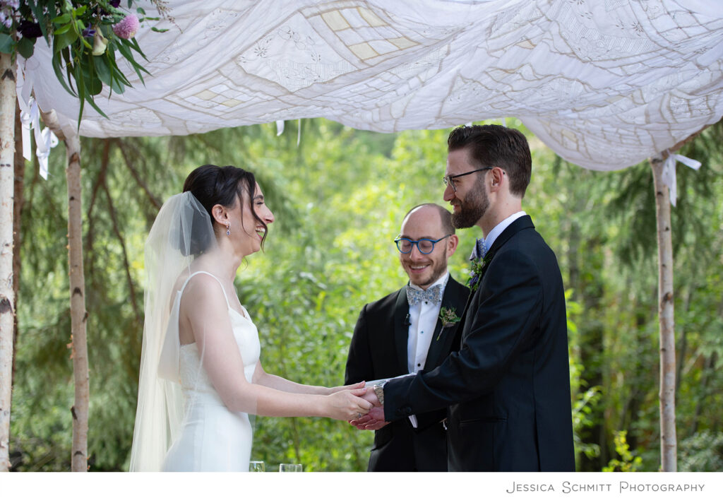 Shira continues, “My brother did an amazing job officiating our ceremony beneath a chuppah that my aunt handstitched from linens from both of our families. We had some of our closest friends and family read blessings to honor us, and we signed our gorgeous ketubah created by David Fisher in Israel.
