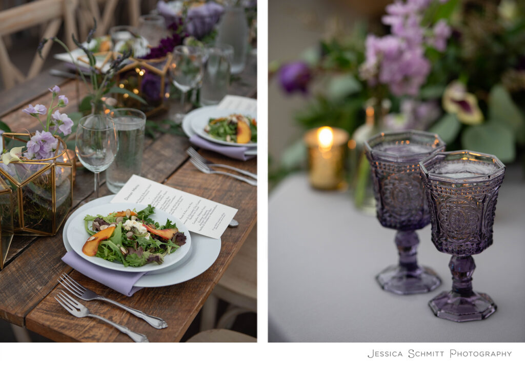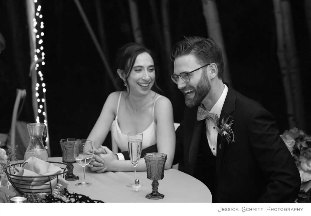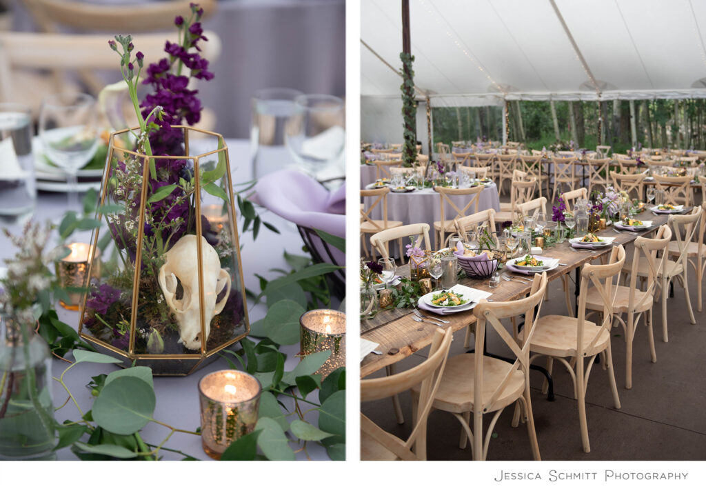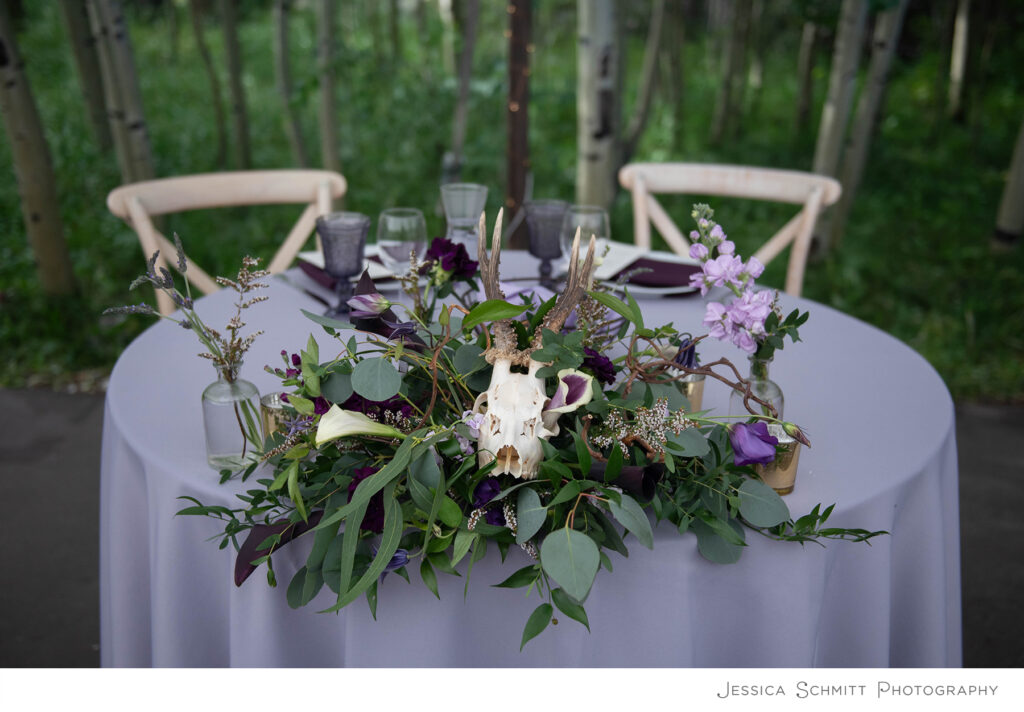 Shira shares, “We wanted our wedding to reflect our personalities, so we chose a venue in the mountains and a style that reflected our love of outdoors. The florals were so beautiful, with a messy, wildflower-type look. The centerpieces were our favorite part of the decor; they featured real skulls of a variety of animals, including fox, raccoon, turtle, bat, mink… and the sweetheart table featured a gorgeous roe deer. I collect skulls, so all of these specimens will be treasured forever. We are also having my bouquet dried and pressed to preserve and display.