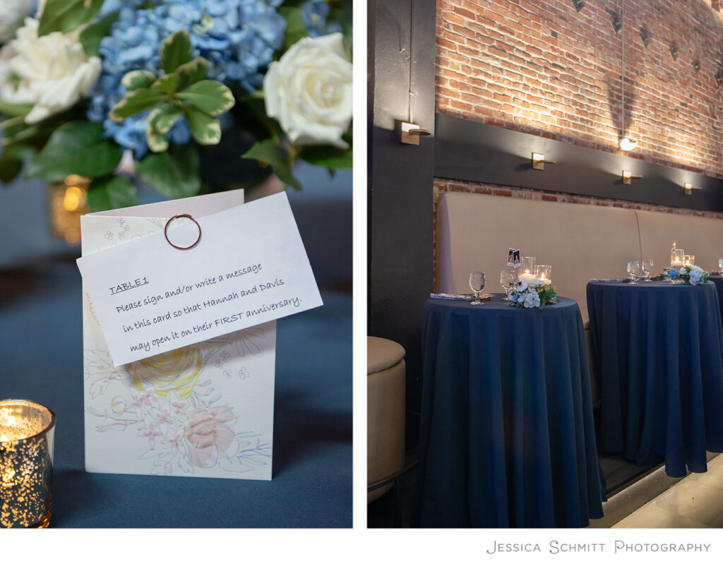 What a fun and unique idea! The bride and groom had a card at each table for their guests to sign and write a message. Table one wrote a card for them to open on their first anniversary, table two for their second anniversary and so on.