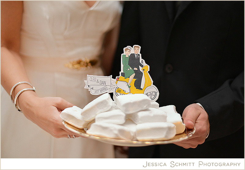 Madison Lee’s cake was brilliantly executed to mirror the molding in the Caffè and pop with a dazzling bunch of edible flowers. The dessert table was completed with Little Boo Boo Bakery delicious champagne wedding marshmallows that taste oh-so-great in a cup of tea. The marshmallow mountain is topped with a whimsical custom-made topper from Etsy’s The Pixelette.