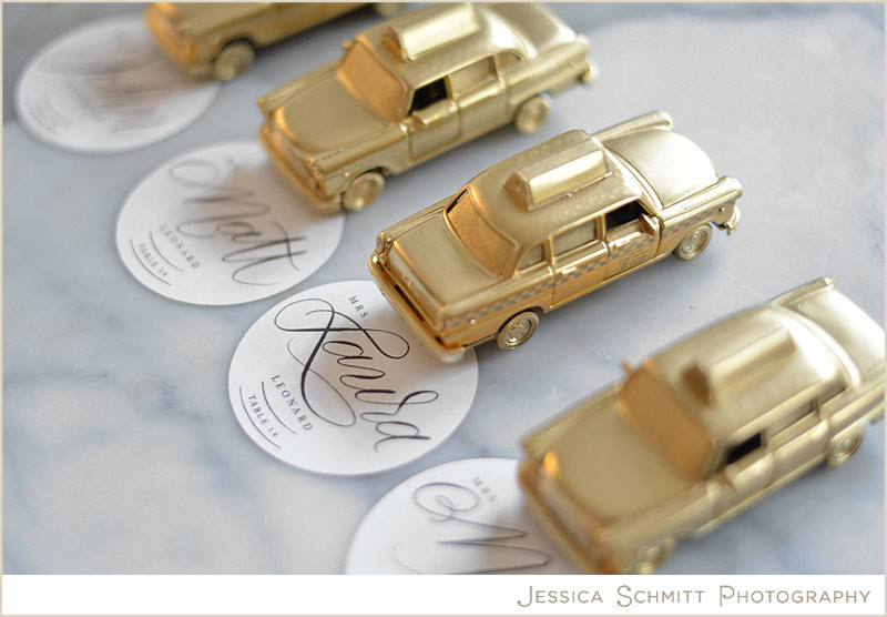 DIY projects are a fun way to include a personal touch to your wedding. These gold spray-painted taxis were the perfect escort to drive guests to their table.