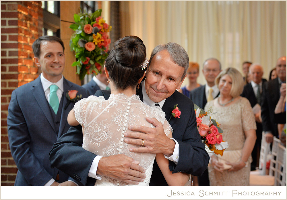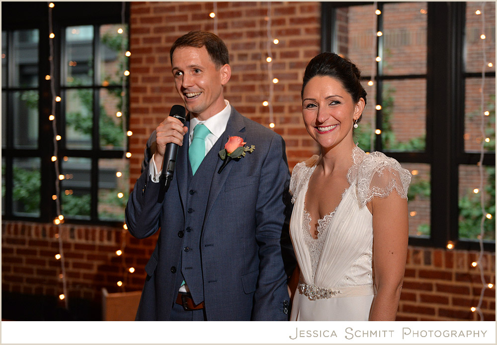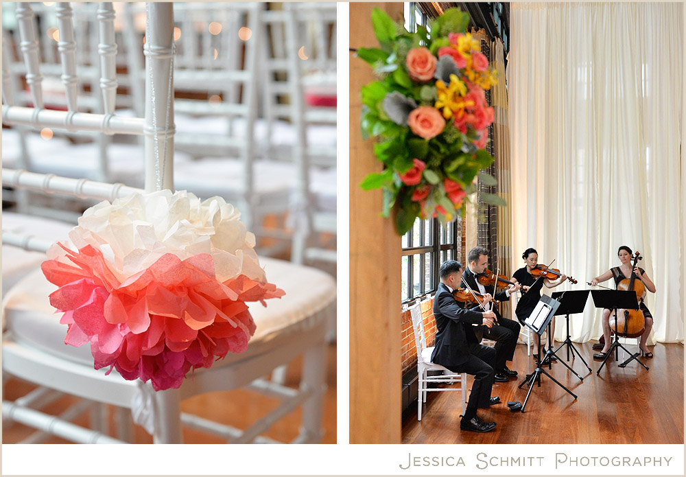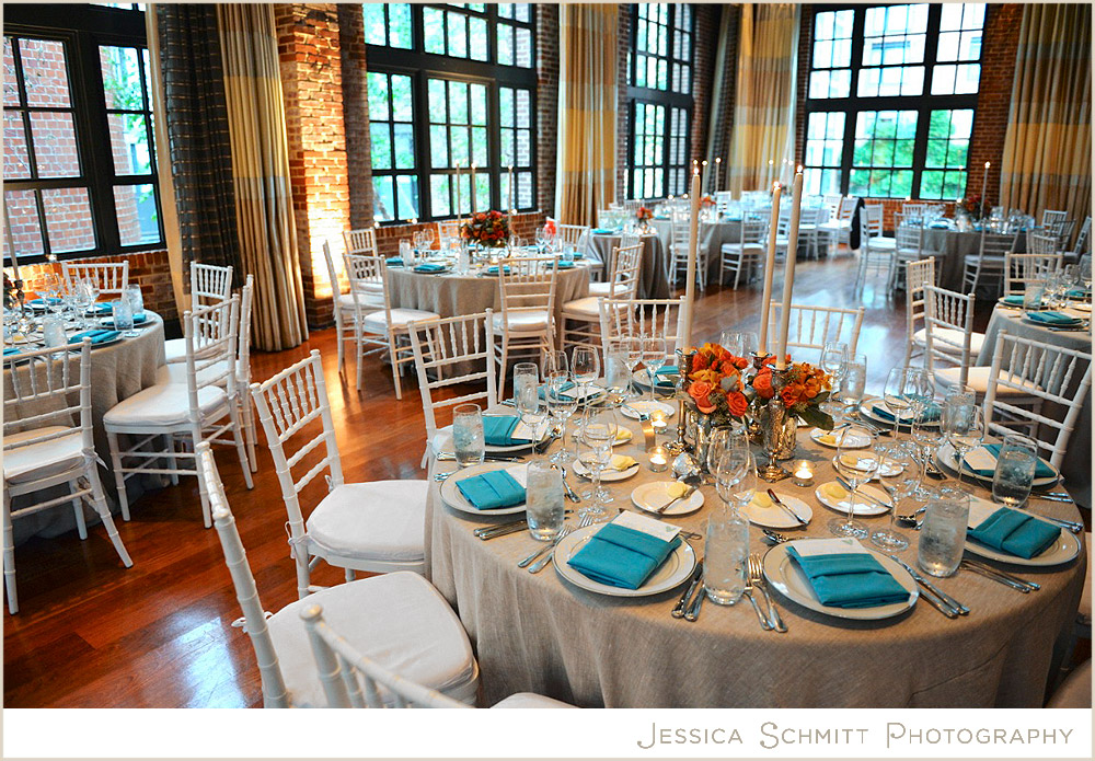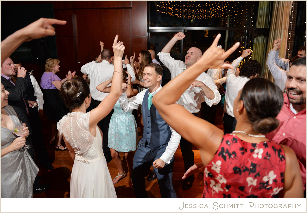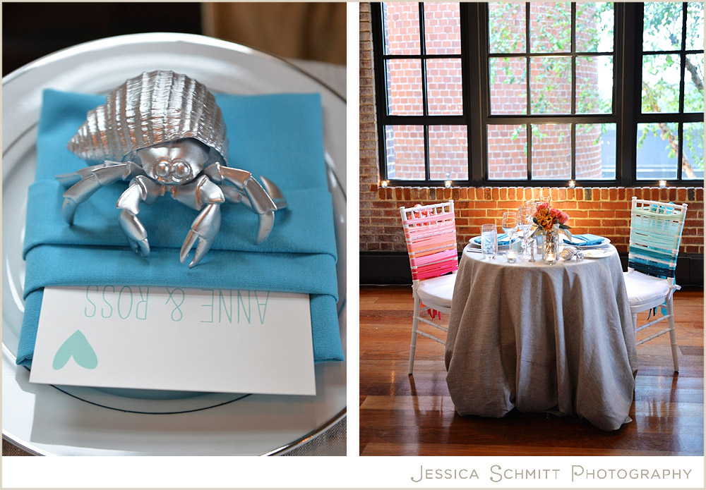 Ross shares, “Most of the wedding style came from Anne’s mind. She had an overall vision from the get-go and between her and Janice of Bellwether Events and Lauren of the Ritz-Carlton, we were able to achieve it. We really wanted something that looked summery and clean, with some individual touches of us to make everyone smile. We loved the look of the Ritz and how it is very upscale but still has an industrial look, and we wanted to use that to complement our style. Thus we had the strings of lights to add a little something extra fun, the silver card holder animals to reflect us, and the mercury glass table numbers and vases/mason jars to complement the industrial look of the room.”