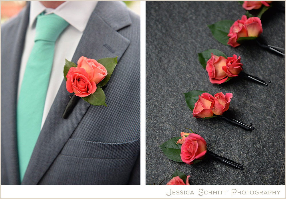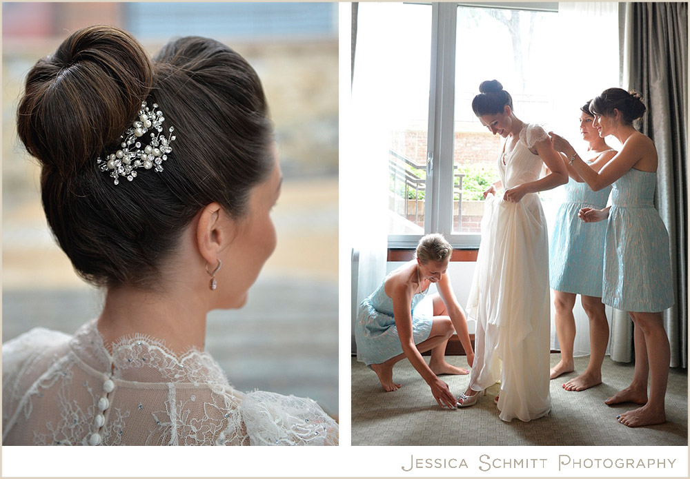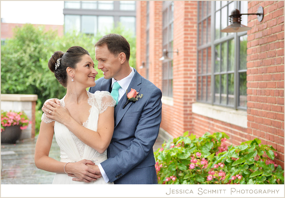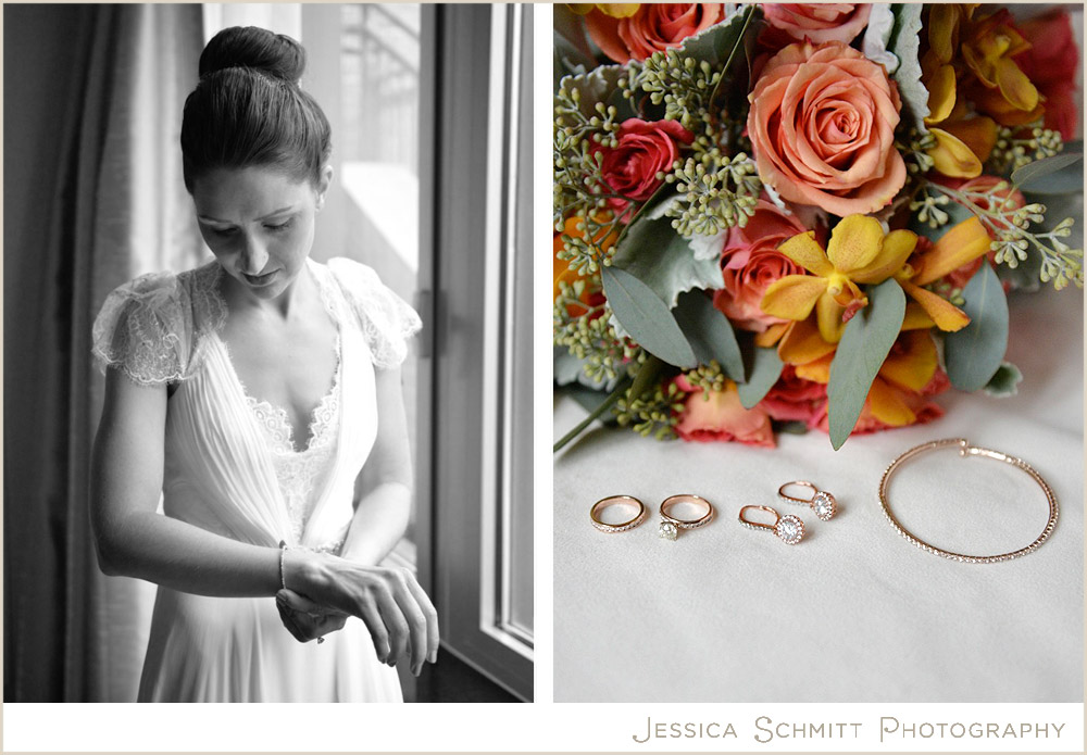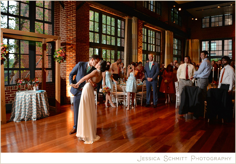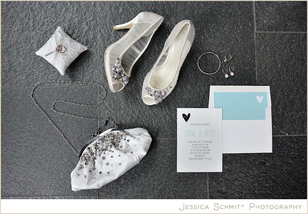 Ross shares, “Most of the wedding style came from Anne’s mind. She had an overall vision from the get-go and between her and Janice of Bellwether Events and Lauren of the Ritz-Carlton, we were able to achieve it. We really wanted something that looked summery and clean, with some individual touches of us to make everyone smile. We loved the look of the Ritz and how it is very upscale but still has an industrial look, and we wanted to use that to complement our style. Thus we had the strings of lights to add a little something extra fun, the silver card holder animals to reflect us, and the mercury glass table numbers and vases/mason jars to complement the industrial look of the room.”