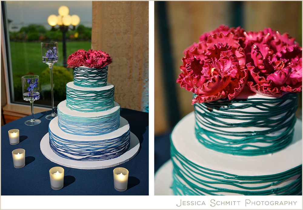 Vibrant ocean-inspired teal cake with edible pink flowers by Lovin’ Oven at Land’s End.