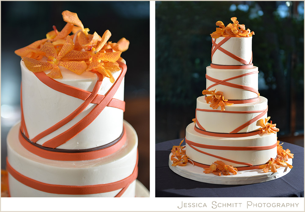 Chic wedding cake with modern orange stripping and orchid detail by Fancy Cakes by Leslie.