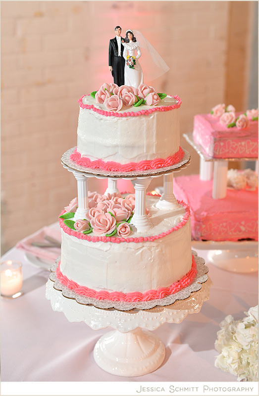Vintage-style white cake with pink frosting detail is homemade by the grandfather of the groom.