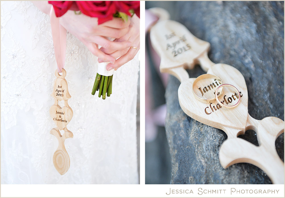 Charlotte carried a beautiful wooden spoon around her wrist. She shares, “My goddaughter Macy and Jamie’s goddaughter Cara gave me a love spoon to carry with my bouquet.”