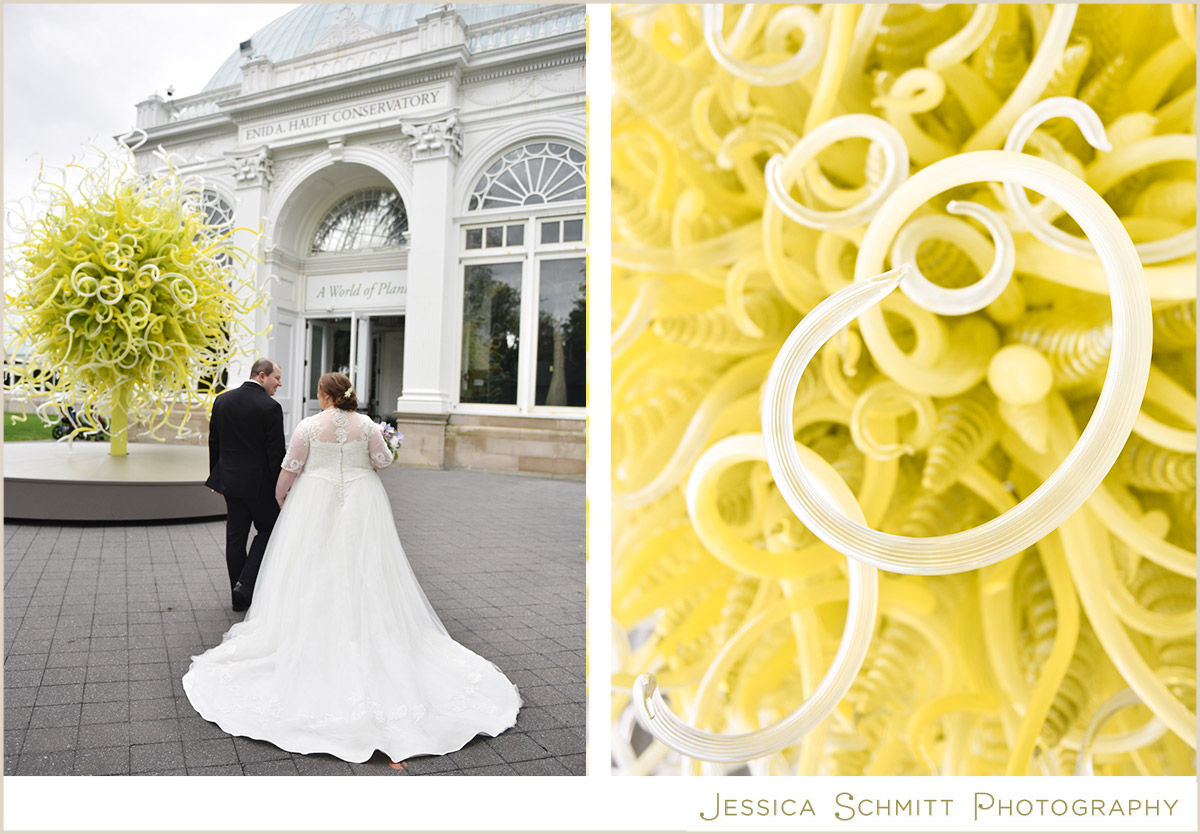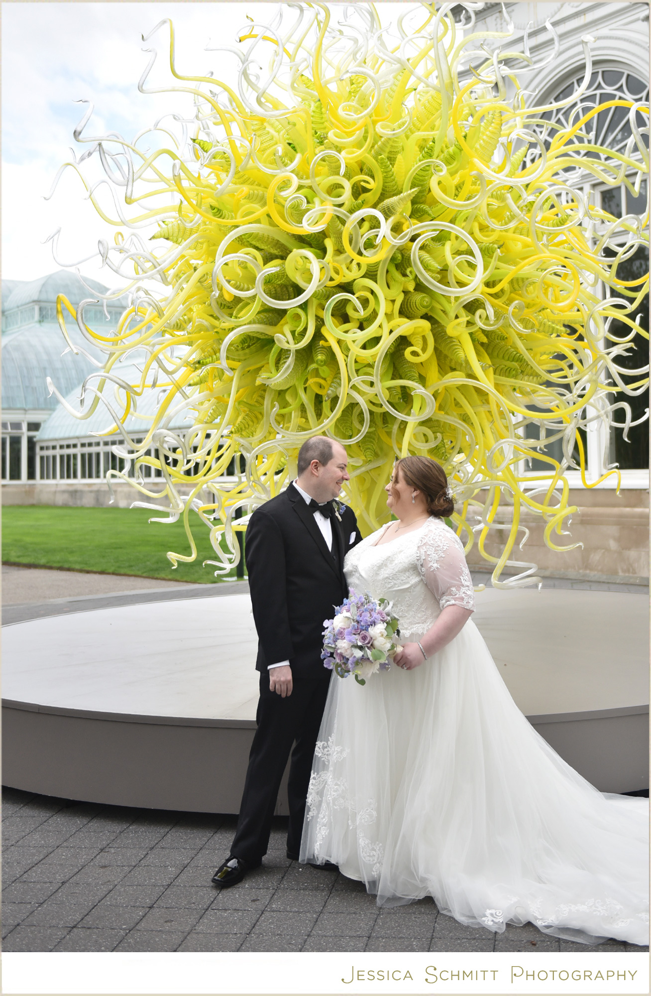 After the ceremony, we all headed to the gardens for portraits and the cocktail hour. A special exhibit of glass artworks by world-renowned artist Dale Chihuly were on view throughout the gardens. We were able to take some photos with one of the dazzling pieces outside of the conservatory.