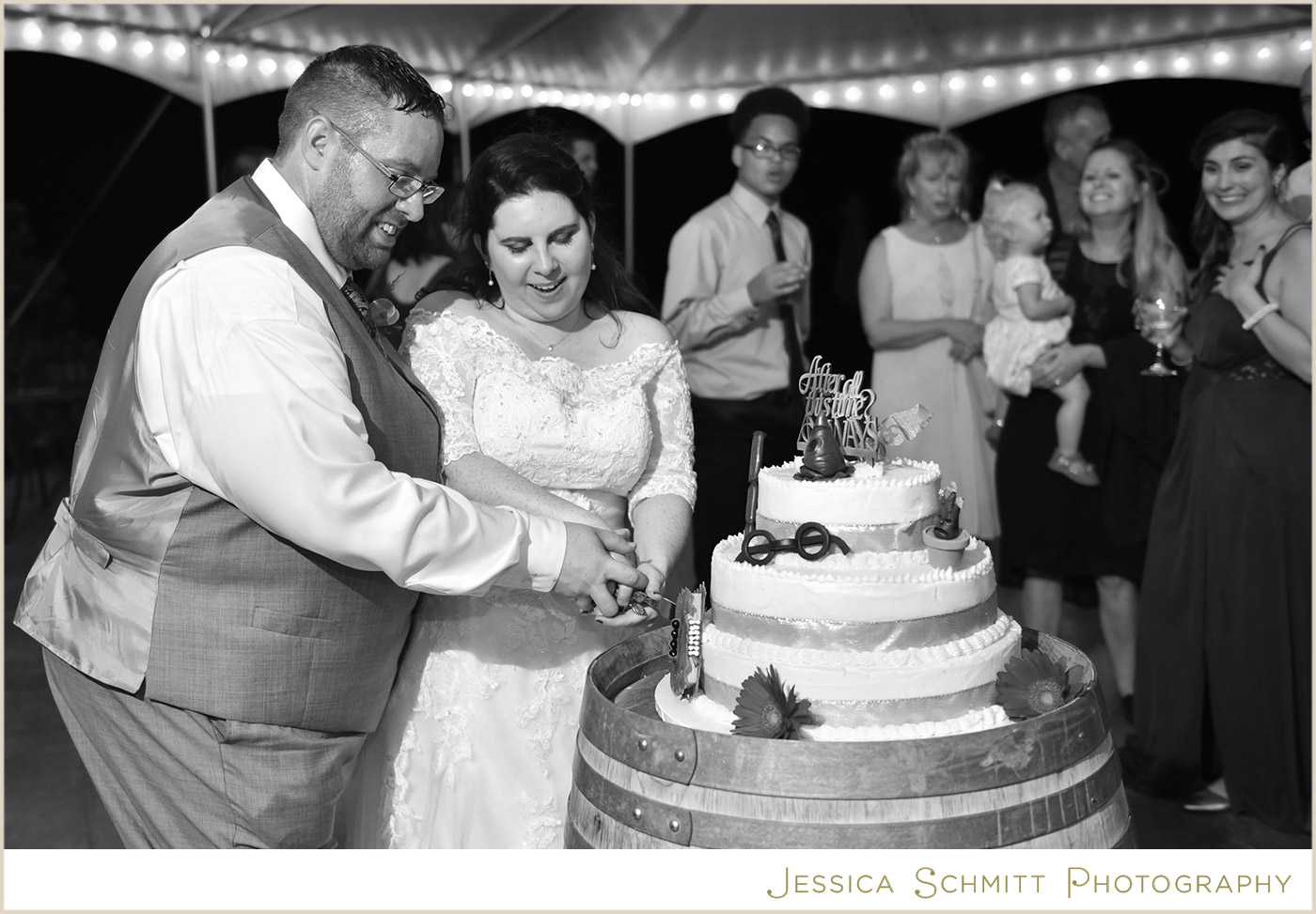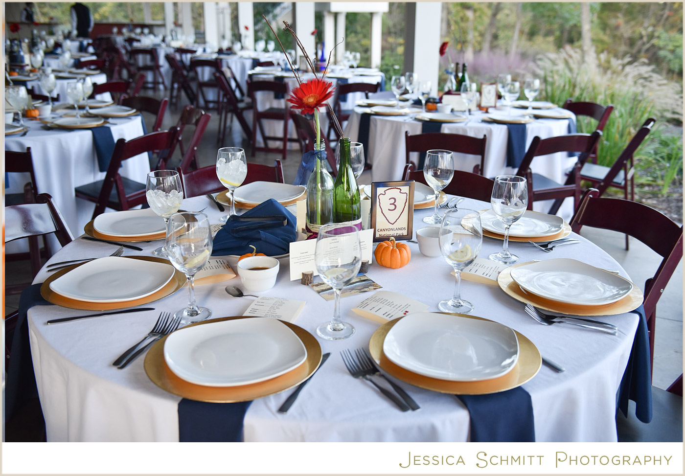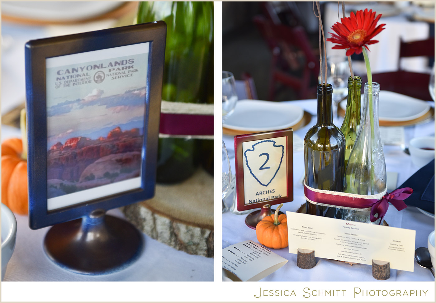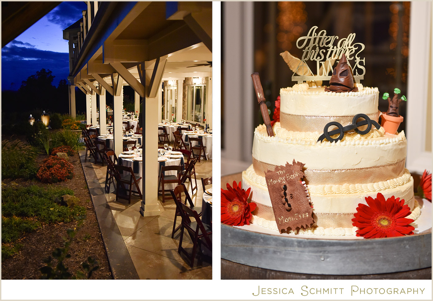 Cana Vineyards was the perfect place for their wedding. Rachel shares, “After Christmas, we somehow settled on a date for the wedding (10/7/17), though I personally think Jim tricked me into the date. Jim did quite a bit of searching to find a venue that was available and within budget. We finally settled on Cana Vineyards because it had such a wonderful view and wasn’t too far from our second favorite Virginia State Park, Sky Meadows State Park. When planning the wedding, we wanted it to be very personal and reflect our personalities as much as possible, which is why we went with a National Parks/Harry Potter theme. We (and by “we,” I mean “I”) made all of the centerpieces from recycled wine bottles; the pieces of wood came from a friend of Jim’s, who had cut down some trees near his house and made the pieces for us, to which Jim glued the bottles.