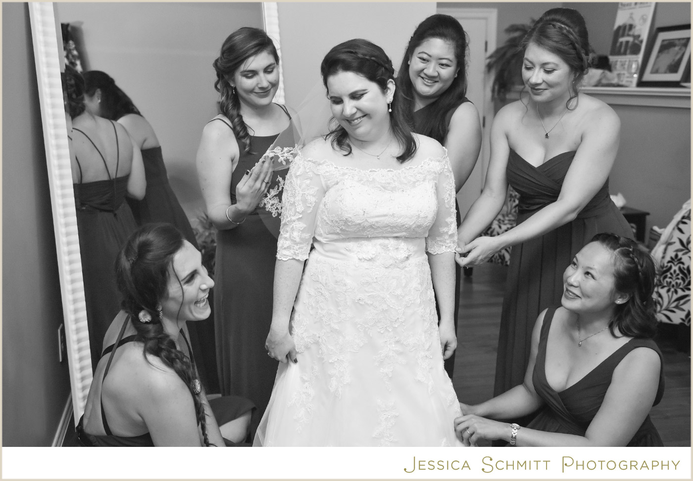 Rachel shares, “Jim and I meet via OKCupid (my matron of honor Susanne helped me put the OKCupid profile together), and after chatting back and forth for a bit, we agreed for a first date at the Mussel Bar in Bethesda, MD (right around the corner from where I work). Jim was about 10-15 minutes late (this would become a theme for the first few dates we went on). The date went very well; I was impressed by his job with the National Park Service, and he asked me all the right questions about my job (most guys before would only feign interest in what I did). After we left each other at the end of the night, Jim found out he had gotten a parking ticket; when he texted me about that, I thought that was the end, since a previous “suitor” had ended things similarly. But a few weeks later, we went on a second date at a little Mexican restaurant in Friendship Heights, and Jim was 30 minutes late. Still, we each found the other person interesting enough to keep texting. Just before Christmas, we went on our third date to ZooLights at the National Zoo in D.C. It was raining and Jim was over an HOUR late. The date didn’t start well, but it ended well. We walked through the cold rain to see all the Christmas lights, then spent time inside at some of the animal exhibits, where Jim wowed me with his random animal knowledge, before we headed off to a little Italian restaurant for dinner in Cleveland Park (we still try to go to that restaurant every year around Christmas). Our fourth date was at my apartment, ringing in the new year watching Anderson Cooper and Kathy Griffin over drinks. After that date, it was pretty official that we were dating.