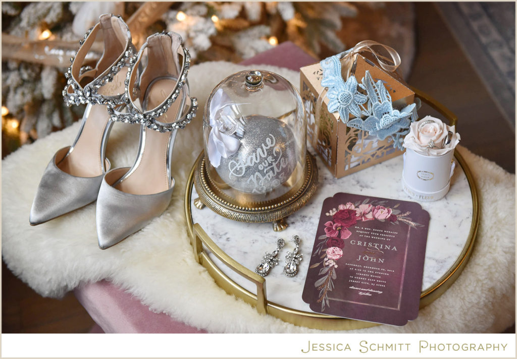 Cristina shares, “Our wedding day truly was THE BEST DAY EVER. I’d describe our wedding style as romantic and elegant, with a hint of glitz. We were surrounded by meaningful people and reminders of those we wish could have been there. From the start of the day, having my family (including our “furbabies”: Chloe and Baby) getting ready with me in our first apartment together was so significant. Chloe and Baby mean the world to us and having them play around the apartment while we all got ready made the morning joyful. I love the holiday season for the togetherness that it brings and having our Christmas tree as my backdrop felt super special. For my accessories, I wore my sister’s wedding earrings and a brand new necklace my Dad gave to my Mom. I also wore my Grandmother’s wedding band on my pinky finger. It felt special to wear jewelry from all of the influential women in my life on my special day.”