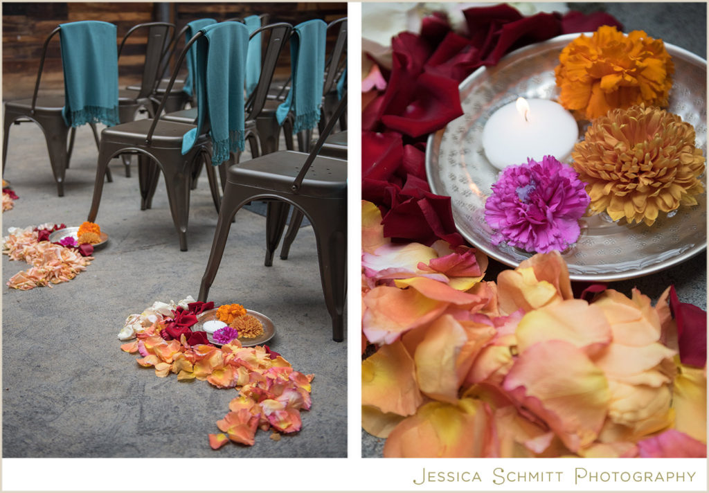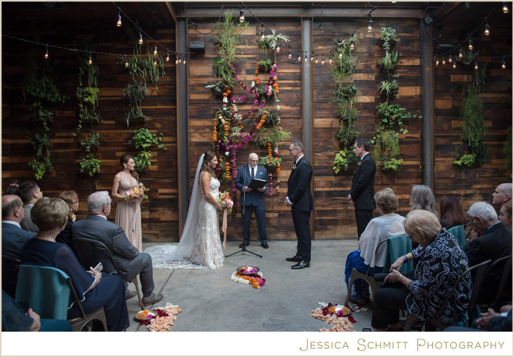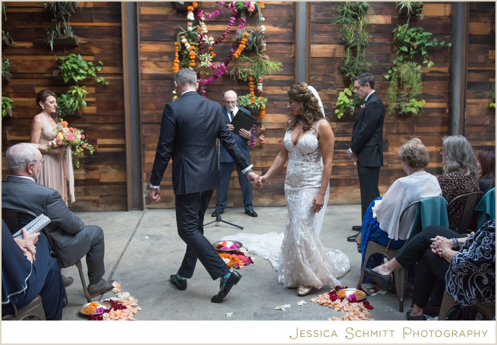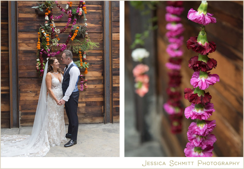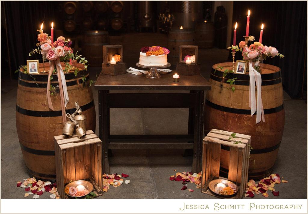Mindy shares, “The wedding was better than I ever imagined it would be. My fascination with Indian culture and weddings inspired the decor and color scheme for our wedding. Kehrin made this vision come to life with a hint of Indian tradition paired with a color palette that was bright and vibrant with beautiful traditional floral garlands. The winery’s warmth from the reclaimed wood succulent wall, paired with the modern concrete floor and light filled atrium made for a perfect venue for what turned out to be a dream wedding for me. Seeing the room set for dinner prior to the guests entering brought tears to my eyes. It was magical and everything I imagined.