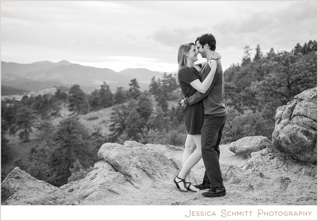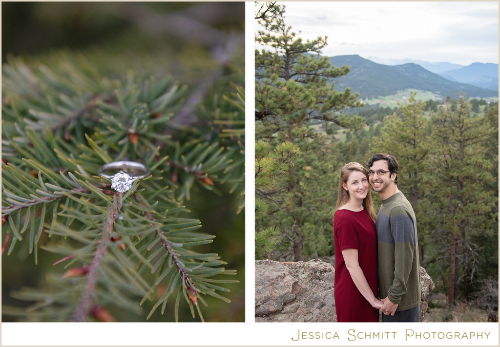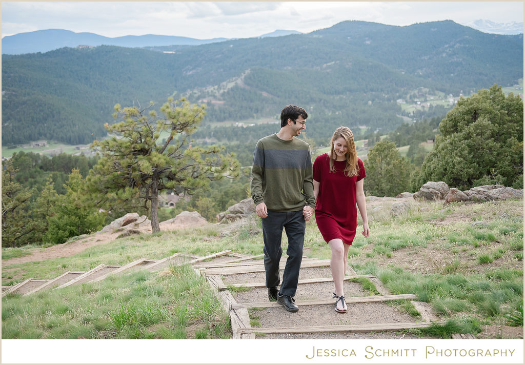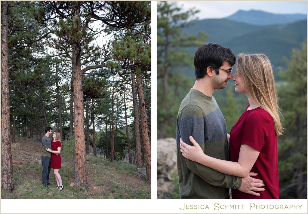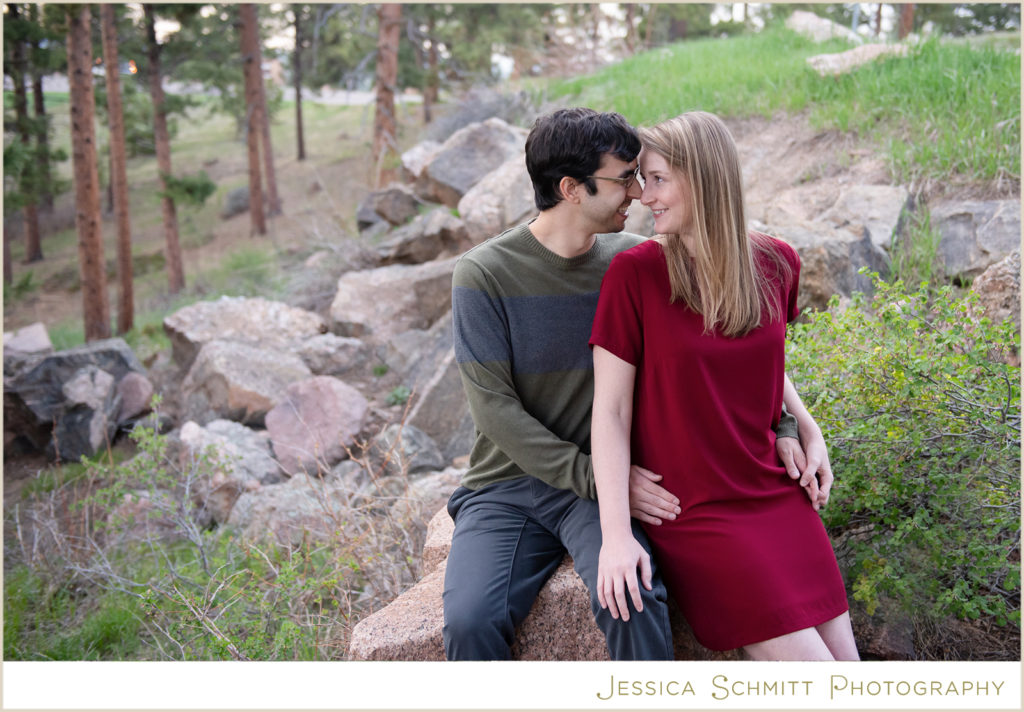 My career brought us to Colorado at the very beginning of March 2020, and even though we couldn’t get married at the end of March as originally planned, I wanted to do something special to celebrate us and our new life in Colorado. I am so glad I found Jessica to shoot our engagement session re-take! Being new to the area, trying to pick a location for a photo shoot was a bit overwhelming, but Jessica suggested so many beautiful locations to choose from. I was drawn towards Mt. Falcon Park because it reminded me of our proposal weekend and the hike where it all began. With our one-year engagement anniversary right around the corner, it was the perfect setting to bring back all those memories of a truly joyous time in our lives.