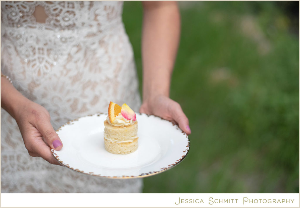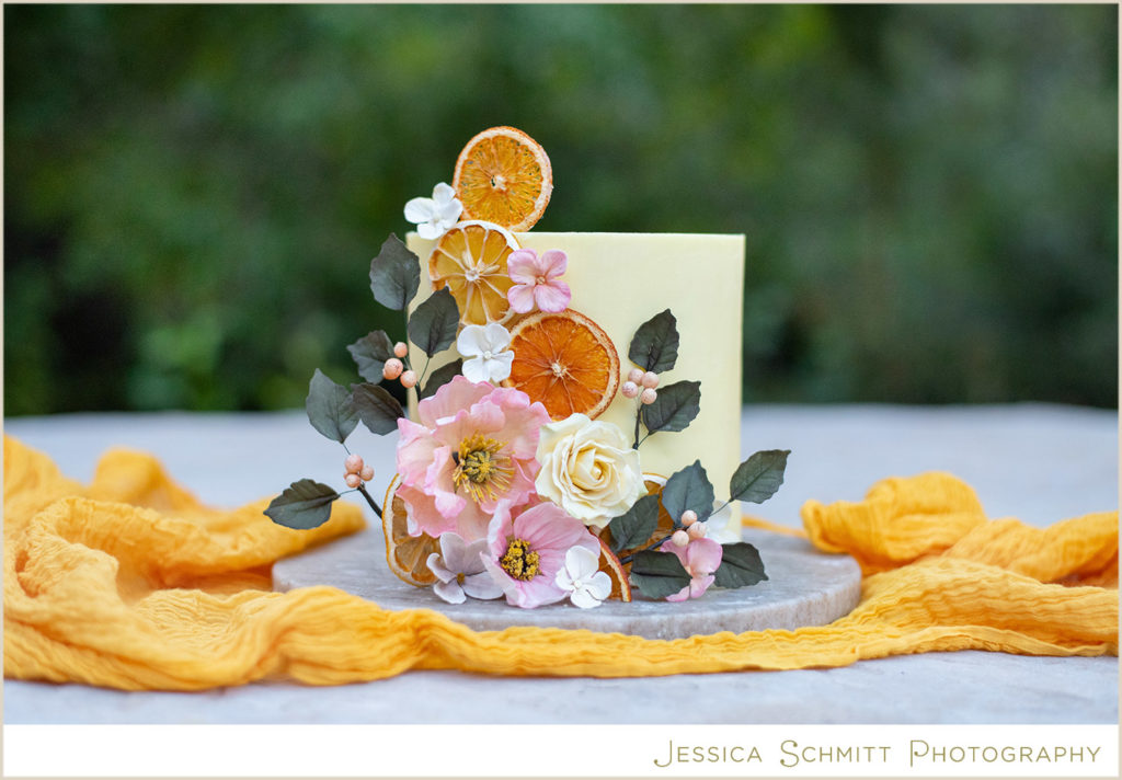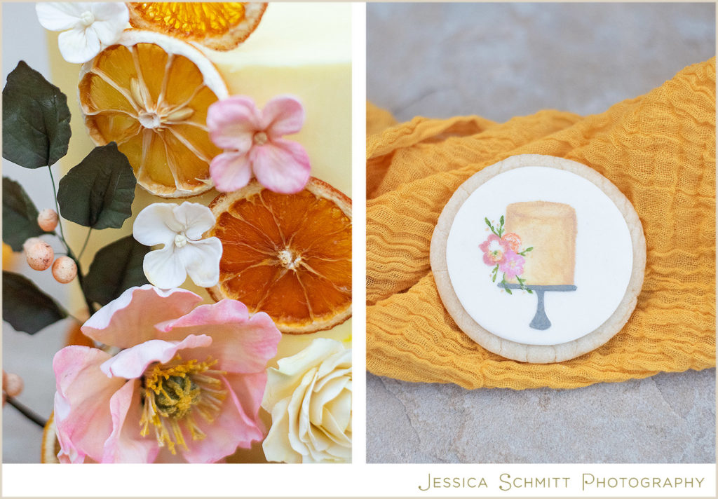 The wedding cake, by The Little Peach, is bright, bold and joyful. The cake design centers around handmade, iced flowers, including a hot pink poppy, yellow rose, orange hydrangea and orange berries and dried orange slices. The cake is mirrored in custom, hand painted cookies, included in the invitation box. Mini individual cakes are also placed at each table setting to give each guest a special treat. The mini cake concept allows for less touch points on the wedding day and makes for a safer option for guests.