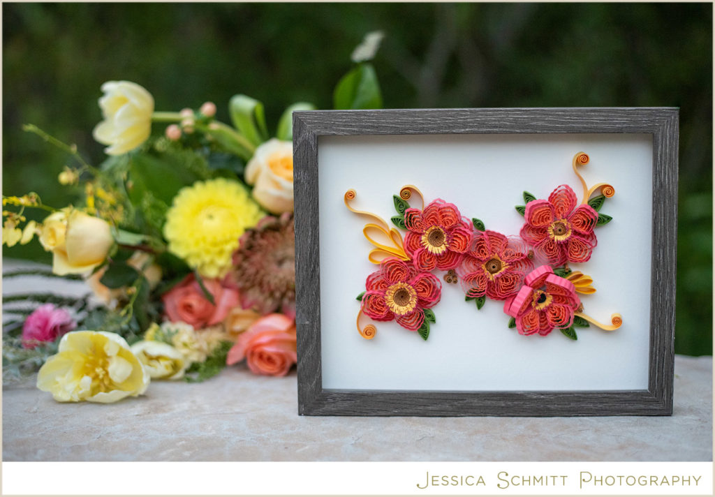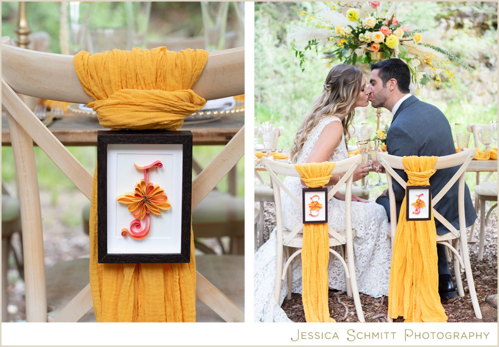 Zahra Ammar created monogram quill paper chair backs for the dinner table. These beautifully detailed pieces are unique additions to a wedding day and special keepsakes!