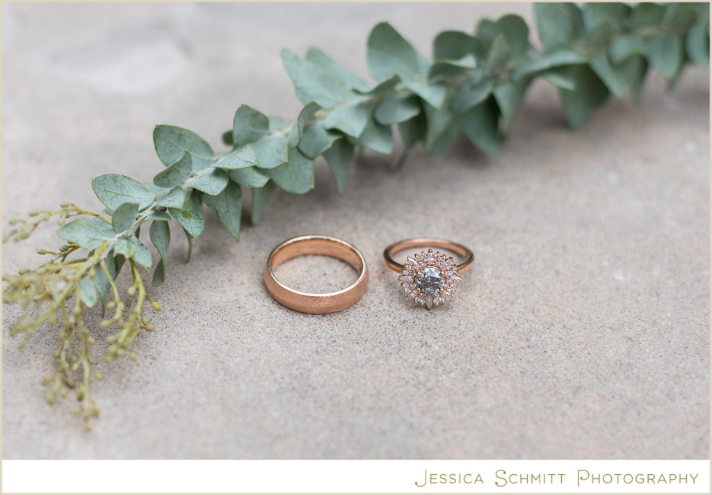 The wedding rings from Sarah O. Jewelry are rose gold and the bride’s ring features a galaxy diamond as part of their cosmos collection.