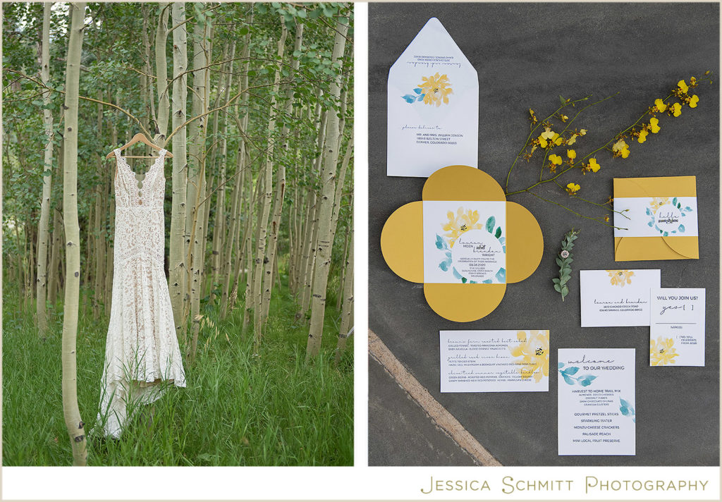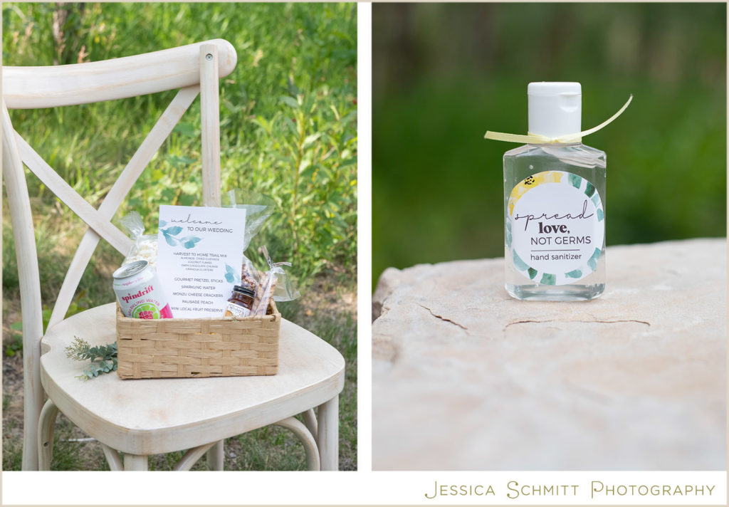 Harvest to Home catering created a welcome basket for guests to enjoy as they arrive at the ceremony. This concept allows guests to minimize their contact with others while still enjoying a personalized treat: Harvest to Home Trail Mix (almonds, dried cherries, coconut flakes, dark chocolate chunks, granola clusters), gourmet pretzel sticks, sparkling water, monzu cheese crackers, and a Palisade peach and mini local fruit preserve.
