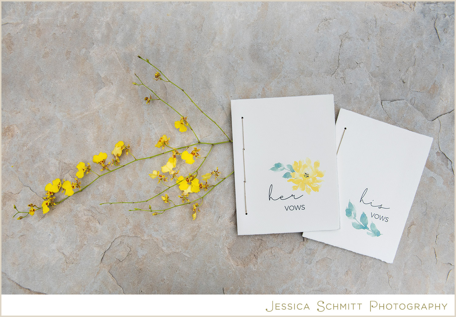 The invitation suite by Tasha Rae Designs is bright and happy with a yellow color palette and delicate watercolor floral and greenery design.