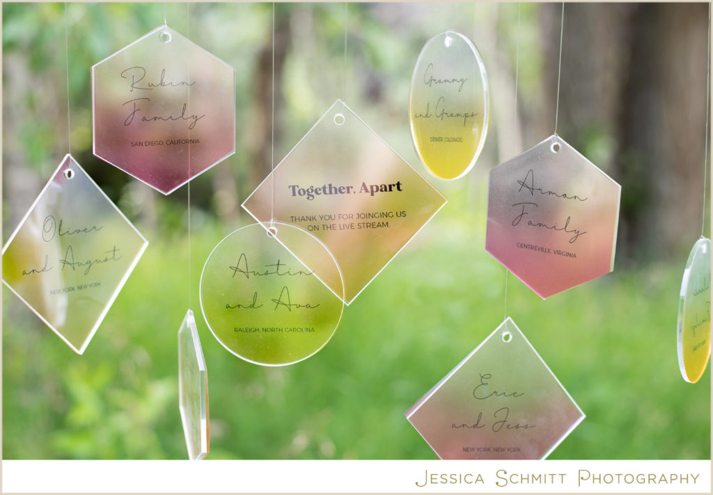 An installation was also made to celebrate all of the family and friends who are “together, apart.” Rather than a traditional escort design, these hanging suncatchers list the names and locations of loved ones who are viewing through a livestream online.