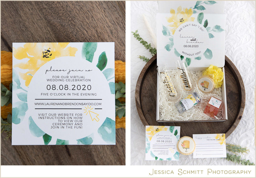 How do you invite someone to livestream a wedding? With an invitation experience! Tasha Rae created a box that includes champagne glasses, champagne gummy bears, confetti, a cookie with a depiction of the real wedding cake hand-painted on it from The Little Peach, along with information to attend virtually.