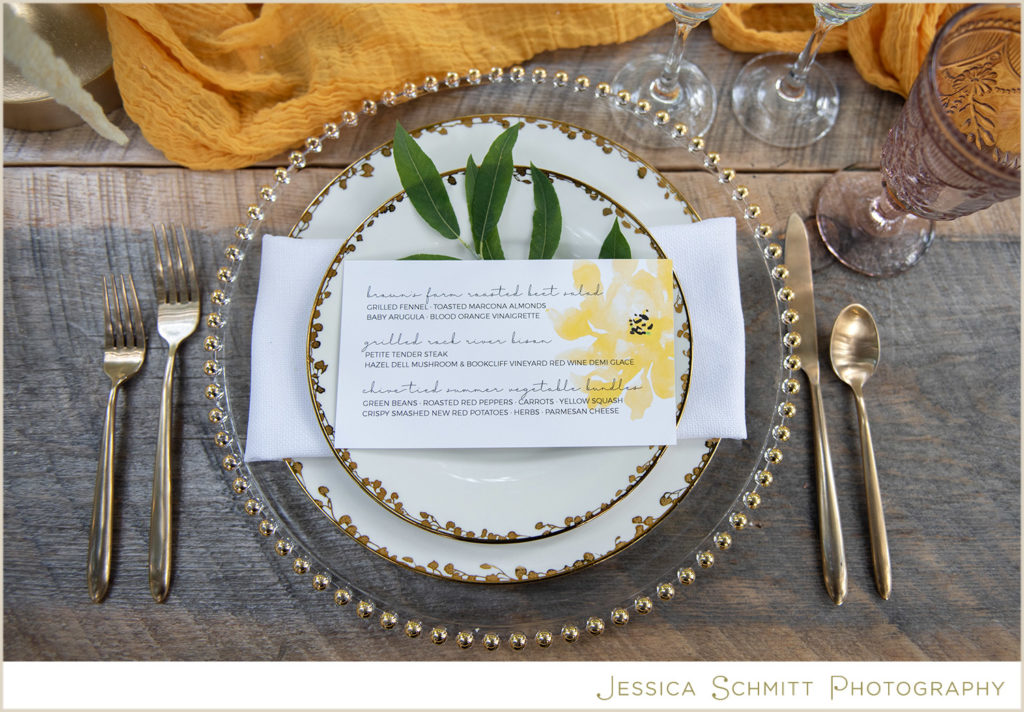 The dinnerware, provided by AllWell Rents, features an organic leaf pattern perfect for an outdoor setting. The gold touches add elegance to the table.