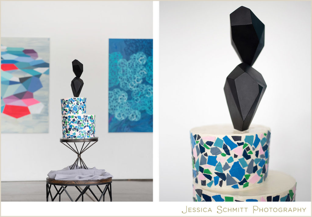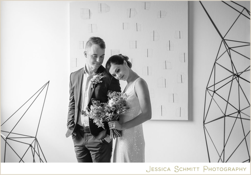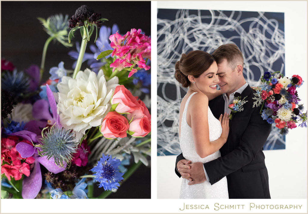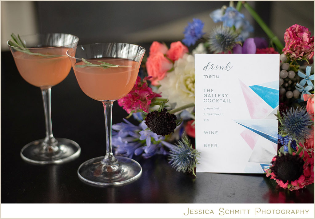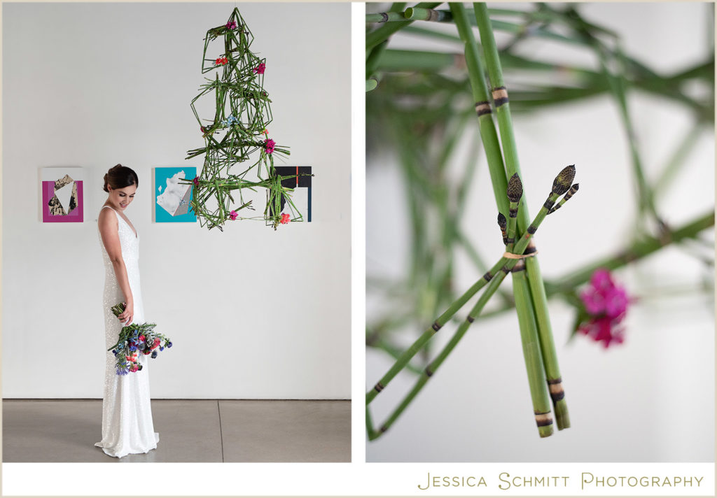 Alison Amy of A Bride’s Best Mate, Chuck Hutson of Hutson Floral Design and I dreamed up this art gallery wedding inspiration. We were inspired by the space, the artwork and a chic city style with pops of color. Along with the creative talents of Chirp’s and Cricket Paper Design, Sweet Ride Bakeshop, Vow’d Wedding Dress, Skin Works Studio and Allwell Rents, the style came together so beautifully. Â