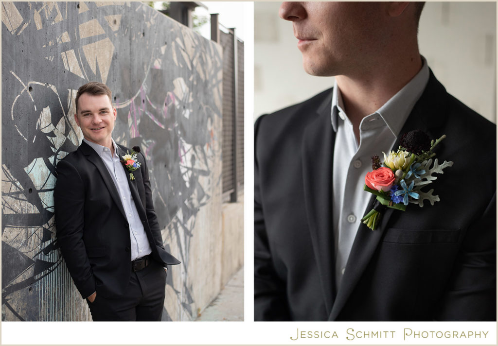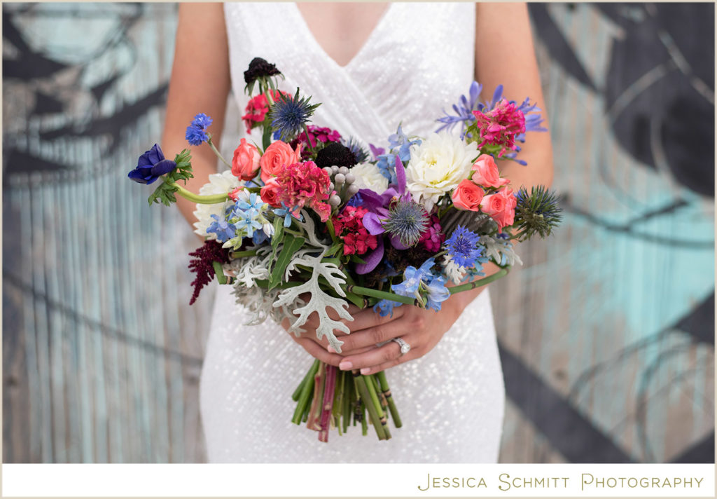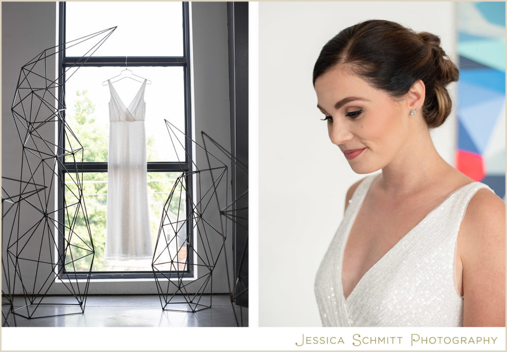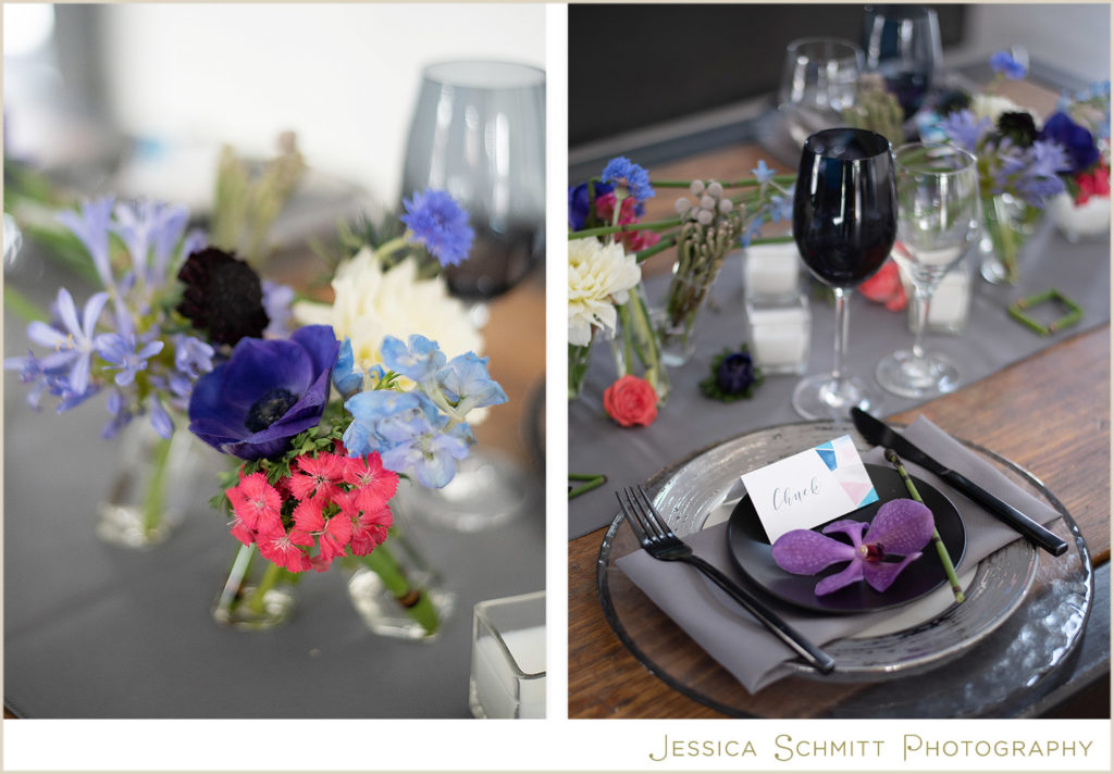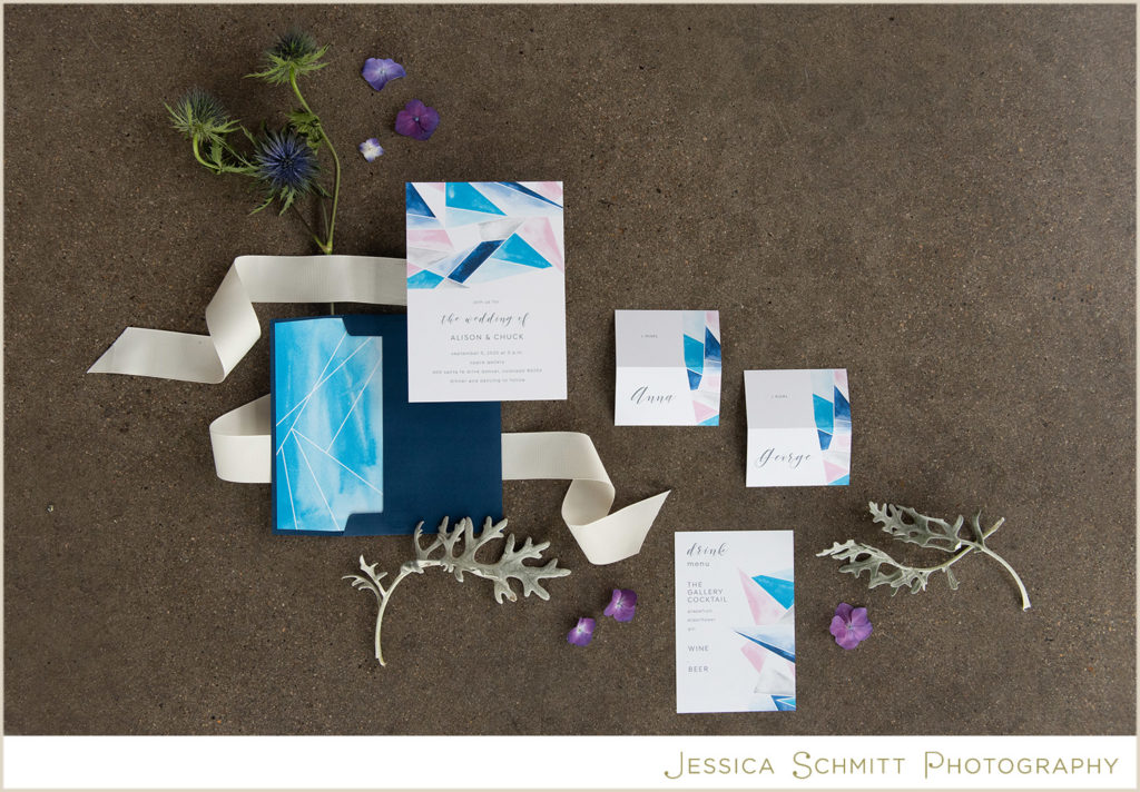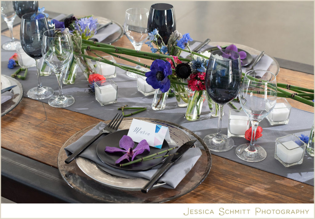 Alison Amy of A Bride’s Best Mate, Chuck Hutson of Hutson Floral Design and I dreamed up this art gallery wedding inspiration. We were inspired by the space, the artwork and a chic city style with pops of color. Along with the creative talents of Chirp’s and Cricket Paper Design, Sweet Ride Bakeshop, Vow’d Wedding Dress, Skin Works Studio and Allwell Rents, the style came together so beautifully. Â