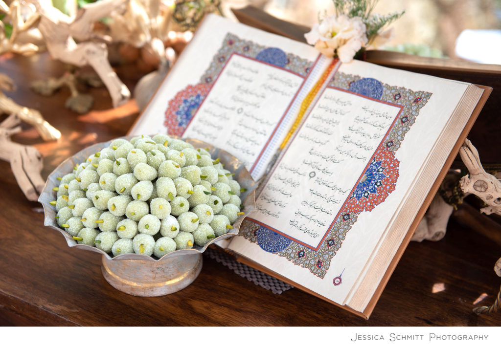 The ceremony included Persian traditions. A mirror brings brightness and gives the couple a view of themselves with their support system – their wedding guests. Kaleh ghand (sugar cones) were rubbed together over the heads of the bride and groom to bring sweetness into their life and marriage.