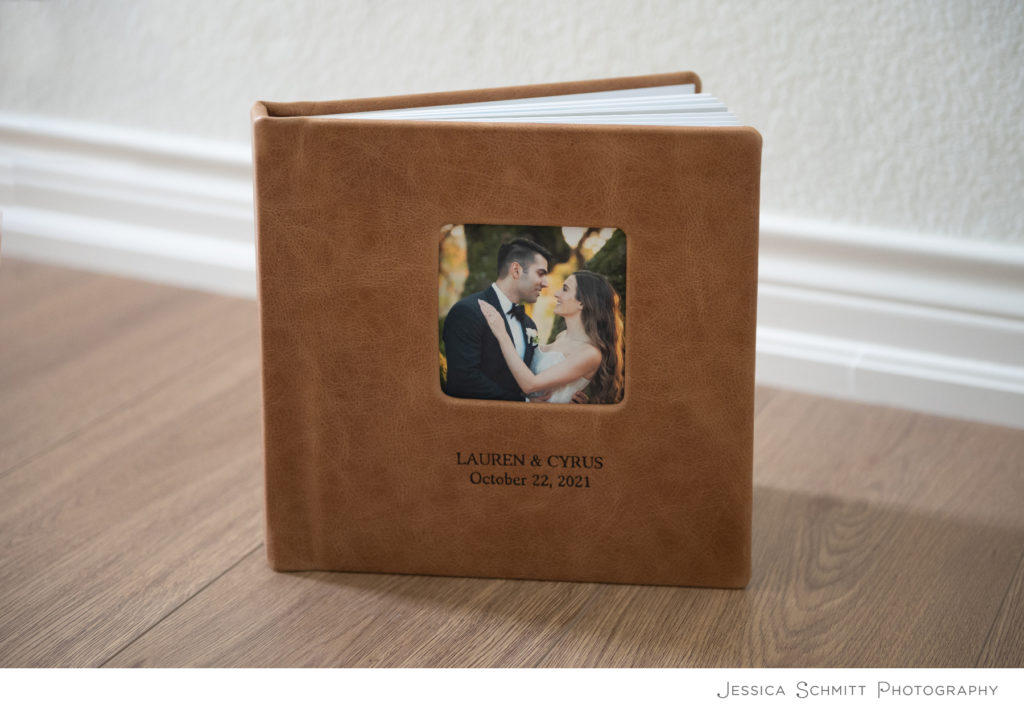 Lauren and Cyrus’s album features the leather album in the color creama with pages in Fuji Crystal Deep Matte Paper.