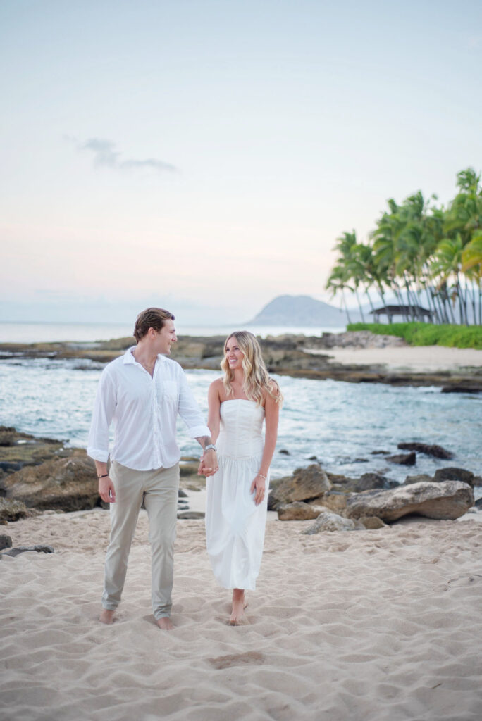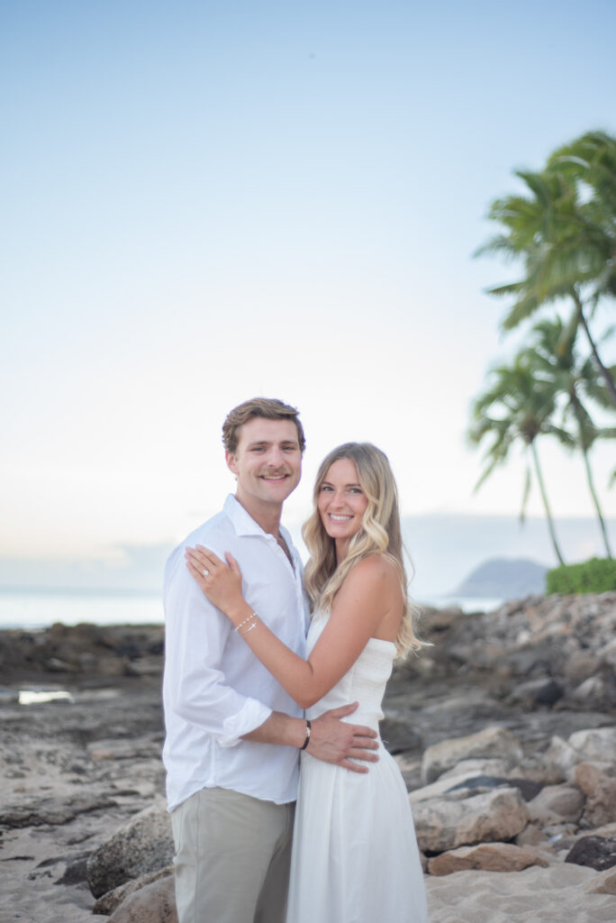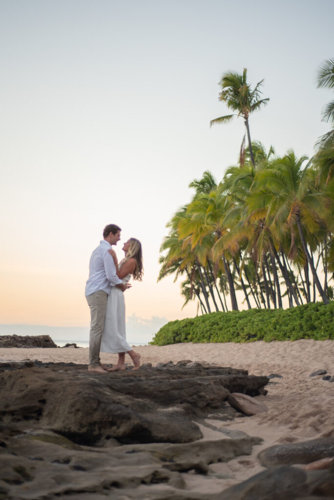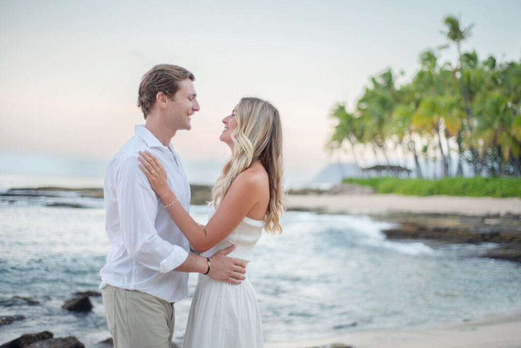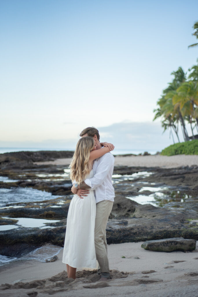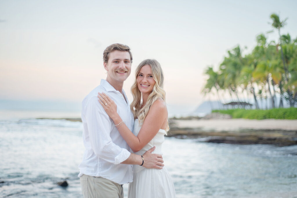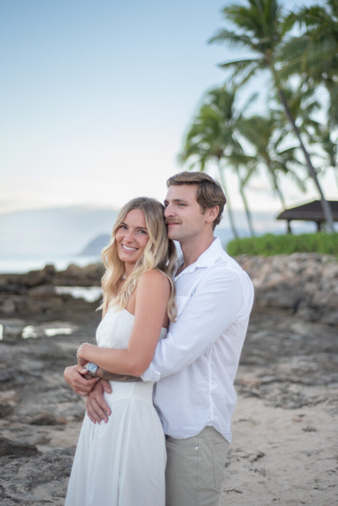 I met Kara and John in Ko Olina in Oahu to celebrate their engagement. We had a beautiful sunrise session on the beach with gentle waves crashing and palm trees blowing in the breeze.