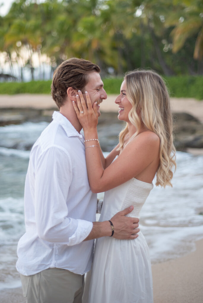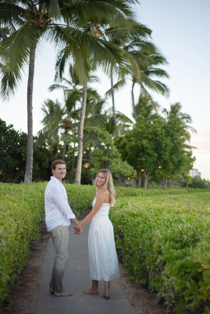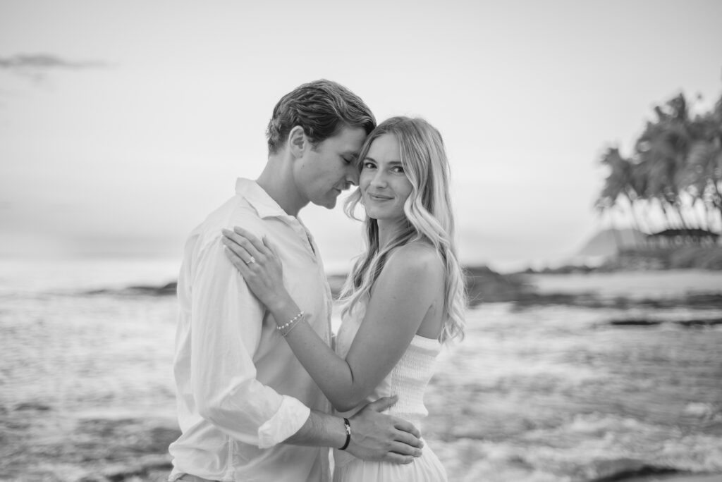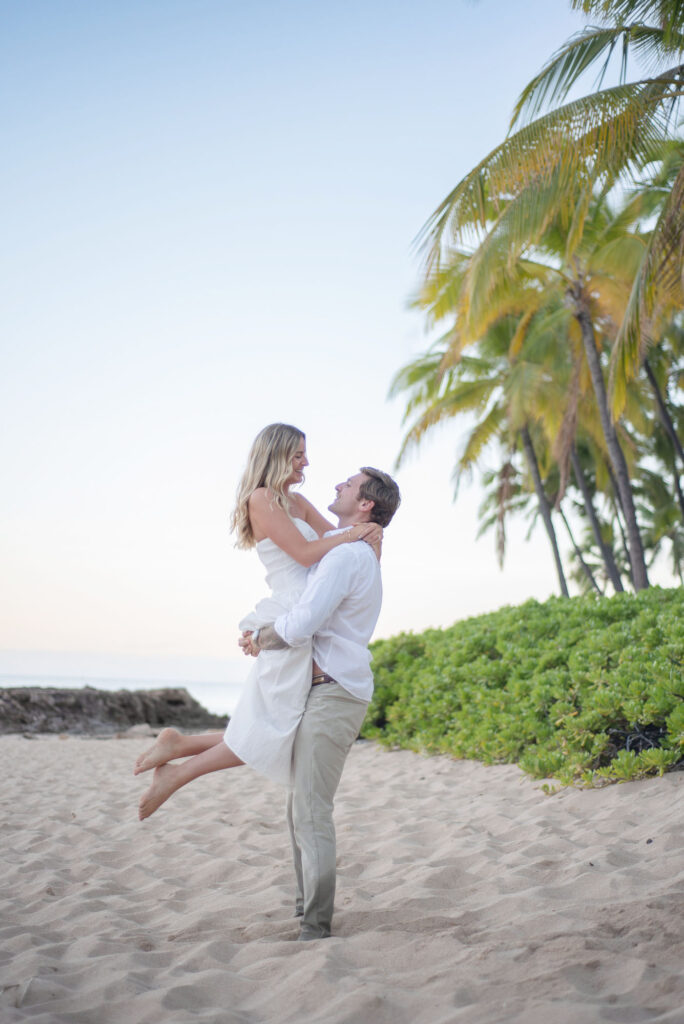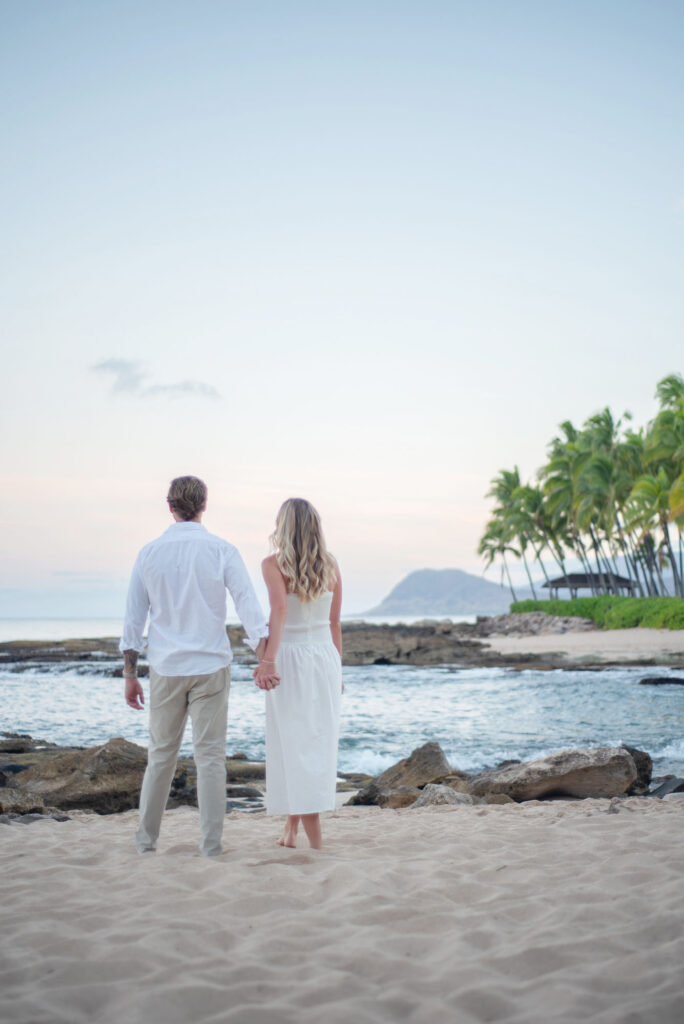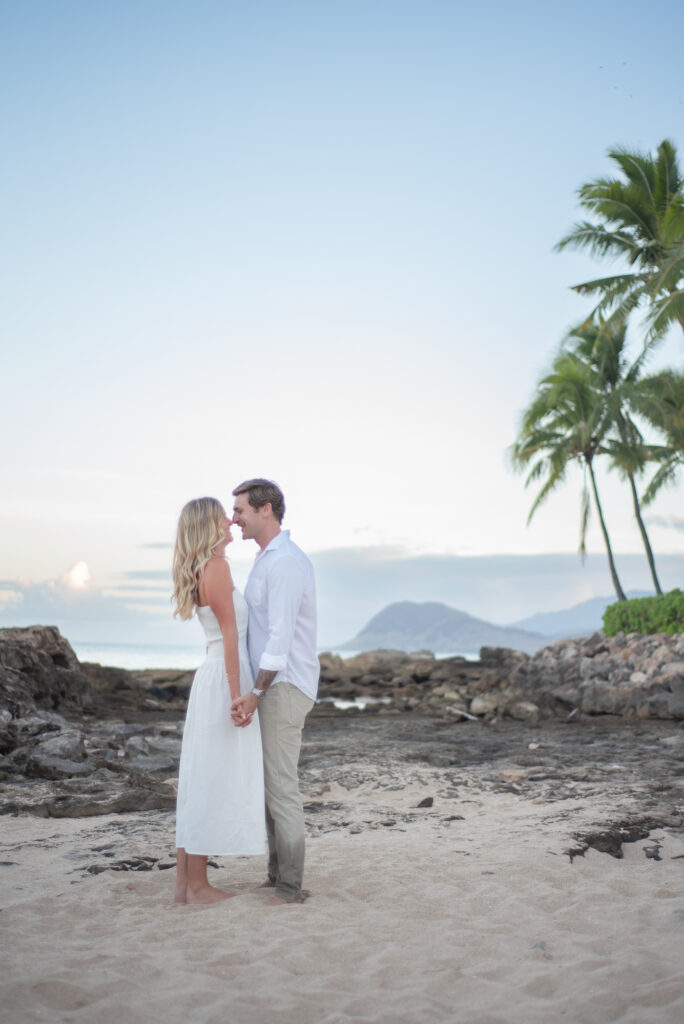 I met Kara and John in Ko Olina in Oahu to celebrate their engagement. We had a beautiful sunrise session on the beach with gentle waves crashing and palm trees blowing in the breeze.