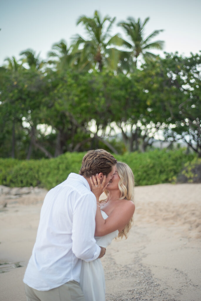 I saw out of the corner of my eye, John randomly dropping his shoes in the sand. I looked up and saw a circle outlined in Dendrobiun Orchids. I immediately copied John and dropped my shoes, not knowing what else to do. He spun me around to face him and got down on one knee. To this day, neither of us have any clue what he said except it felt like it took him 20 minutes to finally ask the one thing I was waiting to hear. He was told to hold that pose for 30 seconds so the photographer could take photos. Immediately after, everyone on the beach was cheering for us. As John got up to hug and kiss me he turned to the beach and did a shaka to our little audience and it is one of our favorite photos.”