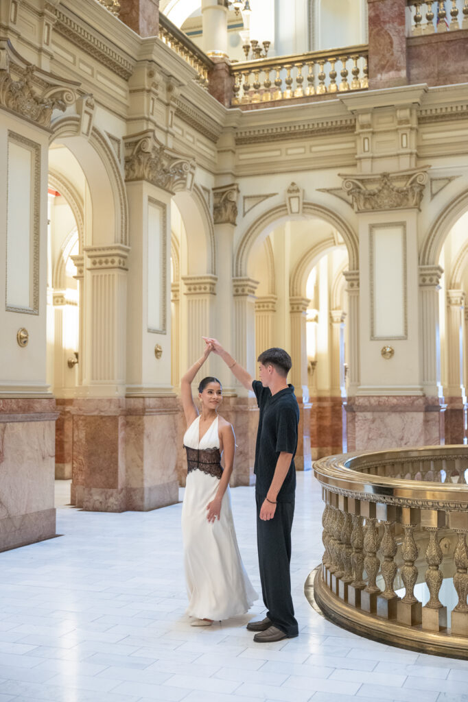 Because the Capitol leans classic and refined, wardrobe choices that mirror that tone tend to photograph best. Think tailored suits, flowing gowns, structured silhouettes, and neutral or muted color palettes. This doesn’t mean you can’t bring personality, just that the styling should complement, rather than compete with, the architecture.