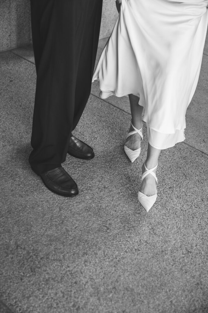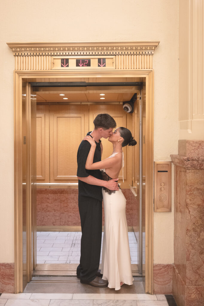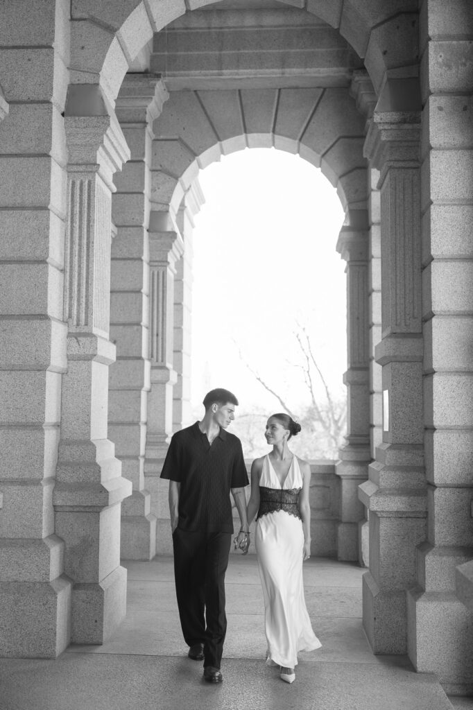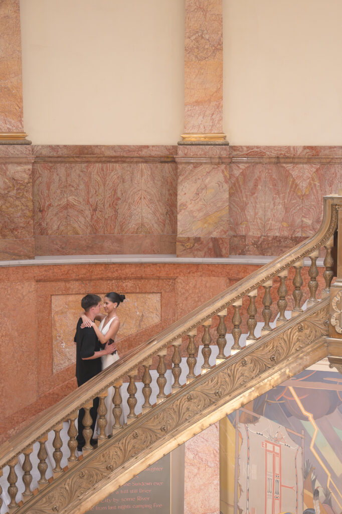 Architectural textures of stone, iron, and glass provide depth and contrast, allowing us to craft images that feel layered and dynamic. The wide-open spaces also give us room to play with movement, whether that’s a flowing dress caught in the breeze or a quiet walk down the steps together.